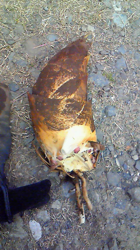 春を探しに行く 掘った竹の子ここ数年、毎年のように竹の子掘りをしているのですが、なぜか今年はなかなか見付けることが出来ず、最後の最後でやっと見付けて掘り出した1本ですなので記念にパチリもうすでに美味しくいただいちゃいましたけどねo(^-^)o
